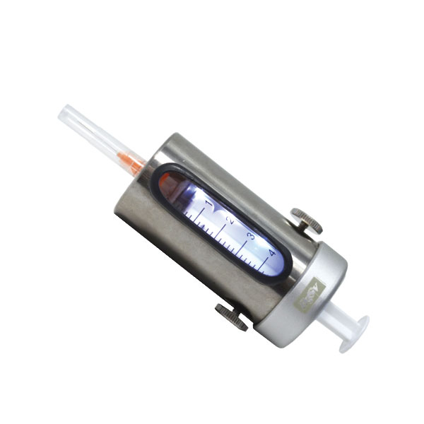 Blindaje de tungsteno para jeringa de 5cc concebido para trabajar con trazadores de PET, posee una ventana de vidrio plomado de alta densidad e iluminación led para proveer una visión clara del volumen contenido en la jeringa.