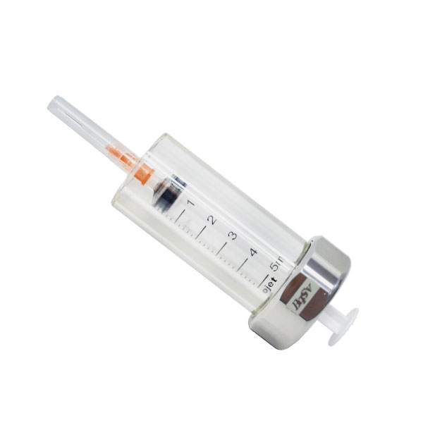 Blindaje de vidrio plomado para jeringa de 5CC para energías medias y bajas, permite una visualización de 360° del contenido de la jeringa.